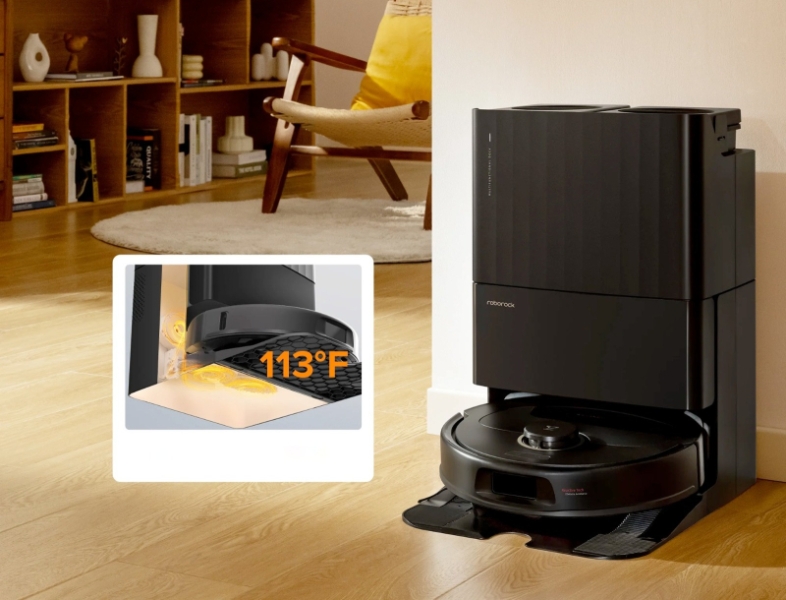 В процессе влажной уборки швабра регулярно очищается от грязи на док-станции горячей водой на 60 °С, а в конце уборки производится её сушка горячим воздухом (45 °С), предотвращая появление плесени и неприятного запаха. При движении к док-станции грязная швабра автоматически поднимается во избежание повторного загрязнения пола. Сброс пыли в мешок док-станции и пополнение резервуара водой производится в автоматическом режиме.