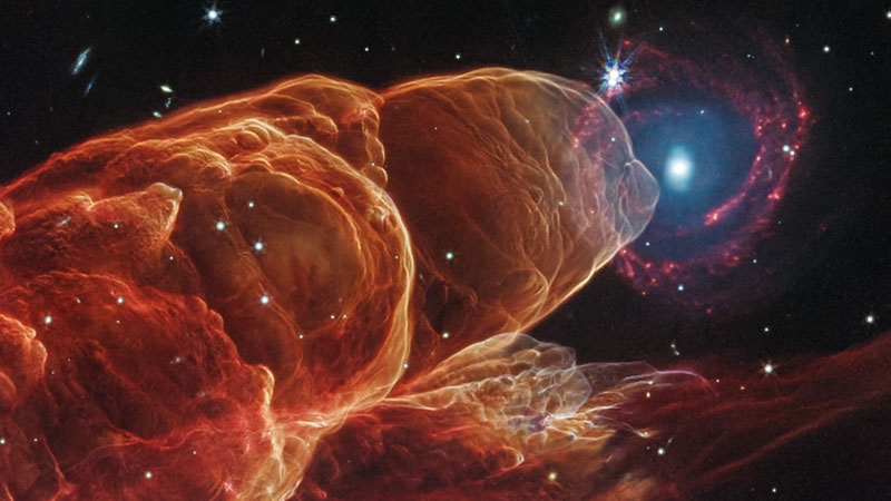 Космическая обсерватория им. Джеймса Уэбба вновь продемонстрировала свои выдающиеся возможности передового инструмента. С её помощью получен самый детализированный снимок новой области звёздообразования, наполненный динамикой движения облаков пыли и газа под воздействием излучения новорождённых светил. Совершенно случайно в кадр попала древняя галактика, создав эффект «глаза торнадо» и символически объединив прошлое и будущее — старые звёзды с молодыми.