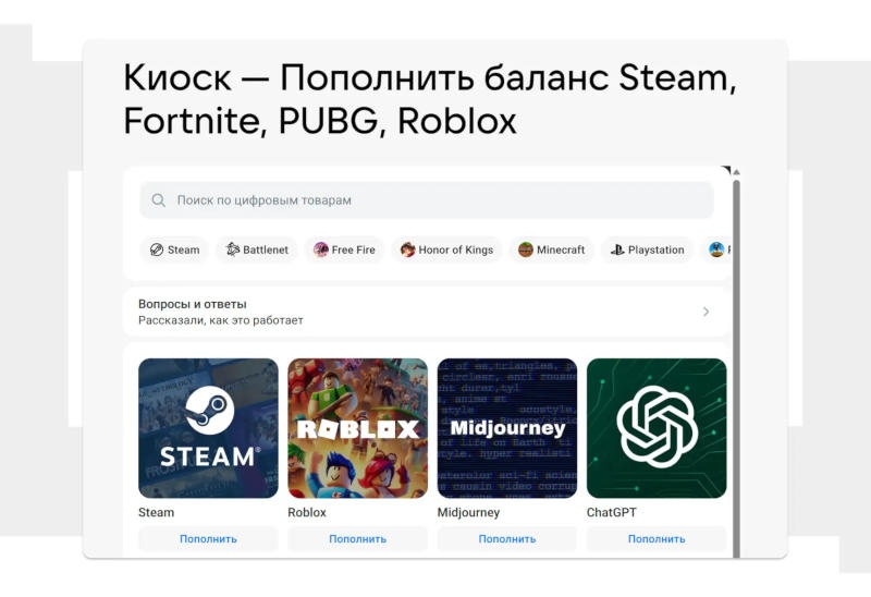 Ранее в разделе «Киоск» магазина RuStore появилась возможность пополнять баланс Steam, Roblox и других сервисов. Сейчас к ним добавились PlayStation для разных регионов, Xbox, Twitch и другие платформы, которые не принимают прямую оплату от российских пользователей.