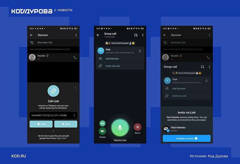 Также сообщается, что групповые звонки защищены сквозным шифрованием (E2E), участники могут по отдельности включать или выключать микрофон и динамик, а также транслировать изображение с камеры.