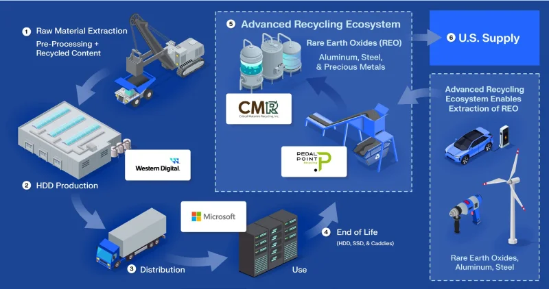 После согласования всех нюансов и с учётом опыта, полученного в пилотных проектах, компания Western Digital совместно с Microsoft рада сообщить о запуске в США крупномасштабной программы утилизации жёстких дисков. В будущем к программе подключатся и другие владельцы масштабных ЦОД, а пока накопители поступают на переработку в основном из центров Microsoft. Там жёсткие диски измельчаются — это гарантирует полную защиту данных от утечек, — а затем отправляются на переработку в компании Critical Materials Recycling (CMR) и PedalPoint Recycling (дочернее предприятие Korea Zinc Company).