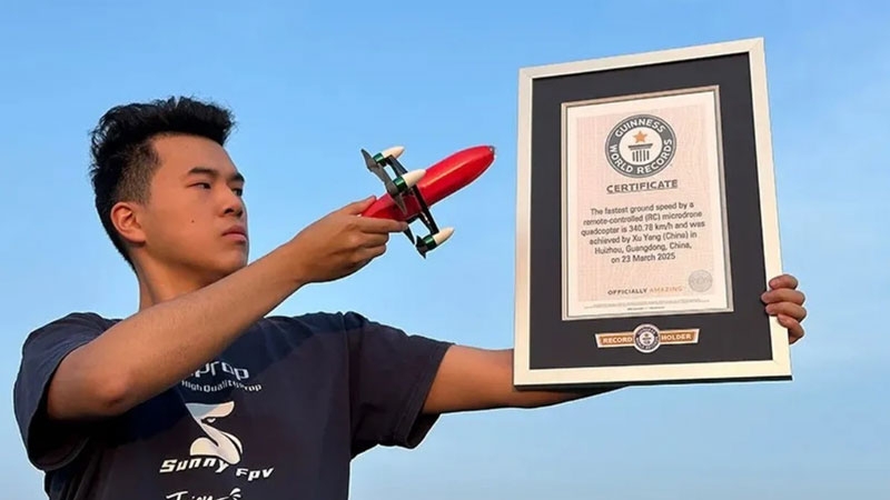 Студент из Китая Сюй Янг (Xu Yang) для Книги рекордов Гиннесса установил новый мировой рекорд скорости дрона массой до 250 г для Книги рекордов Гиннесса. Микродрон разогнался до 340,78 км/ч, тогда как предыдущий результат составлял 219 км/ч. Примечательно, что студенту помогали советами авиамоделисты-рекордсмены, добившиеся успехов в прошлом. Новый чемпион также не собирается делать секрет из своей разработки и готов делиться опытом.