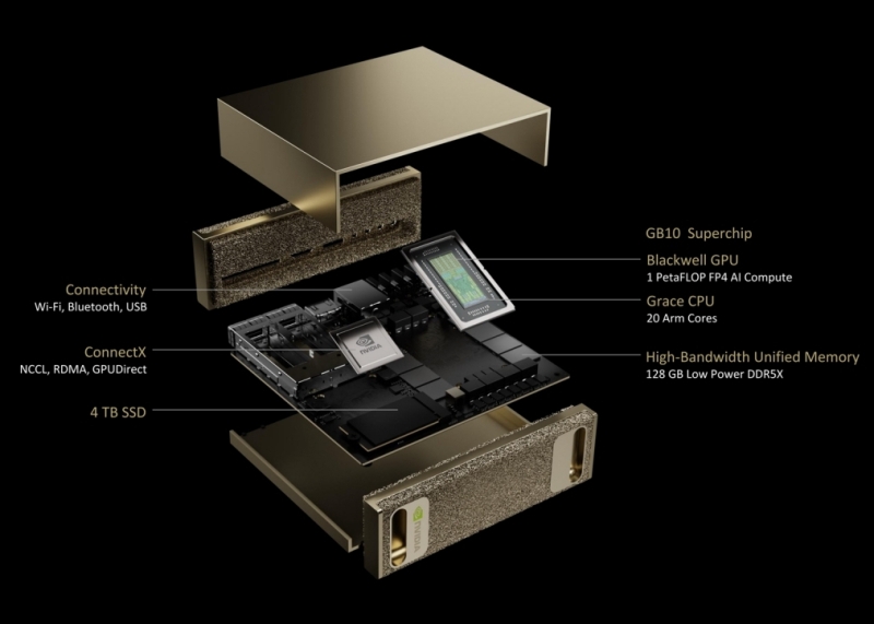 Выяснилось, что DGX Spark оснащён GPU с 6144 ядрами CUDA — ровно столько имеется и у десктопной видеокарты RTX 5070. В описании устройства говорится, что DGX Spark, ранее известный как Project Digits, использует суперчип Nvidia GB10 Grace Blackwell, объединяющий новейший графический процессор Blackwell и 20-ядерный центральный Arm-процессор Grace через NVLink-C2C в компактном корпусе. Помимо 6144 ядер CUDA графический чип получил тензорные ядра пятого поколения, четвёртое поколение RT-ядер для трассировки лучей, а также новые блоки кодирования видео. Система имеет 128 Гбайт общей LPDDR5x-памяти, доступной как CPU, так и GPU, что позволяет работать с моделями искусственного интеллекта до 200 миллиардов параметров. Для системы заявления производительность до 1000 TOPS в вычислениях FP4 для ИИ.