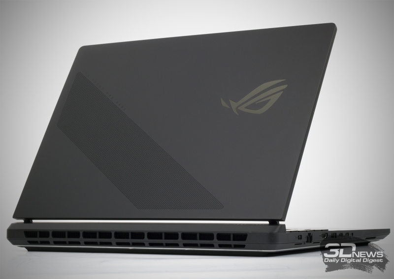 Конструкция корпуса рассчитана в первую очередь на эффективное охлаждение горячих чипов Intel и NVIDIA. Это сразу же бросается в глаза, так как инженеры ASUS намеренно увеличили размеры устройства, а вся задняя сторона, по сути, представляет собой одну большую вентиляционную решетку.