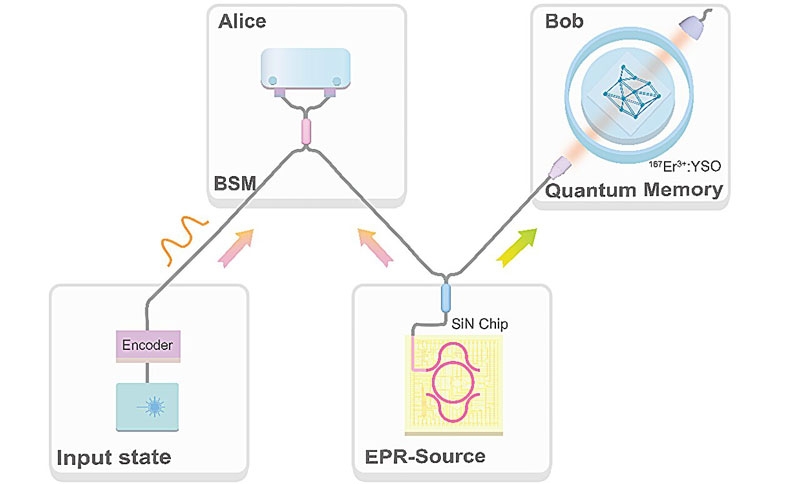 Разработка китайских учёных обещает радикально решить проблему передачи квантовых состояний на большие расстояния. Представленная учёными платформа состоит из пяти структурных компонентов: один для подготовки входного состояния, другой для генерации запутанных пар фотонов (ЭПР) с помощью интегрированного фотонного чипа, третий для измерения состояния Белла, четвёртый для распределения частот и точной настройки, и пятый — это твердотельная квантовая память на основе ансамблей ионов эрбия. Первые четыре компонента раньше использовались для других экспериментов, а пятая — твердотельная память — реализована впервые.
