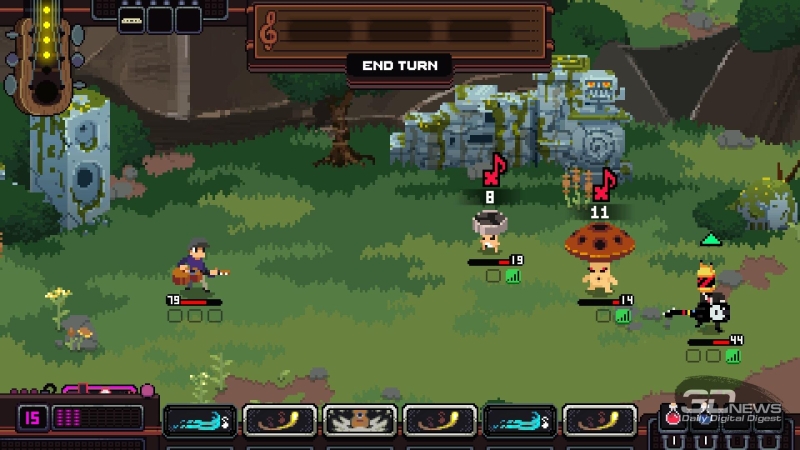Есть ощущение, что бас-гитара — самое сильное оружие, но и остальные инструменты по-своему хороши. Лично у меня постоянно возникало желание переключаться между ними, чтобы всё испробовать. Особенно когда регулярно получаешь новые приёмы, покупая их в магазинах или взаимодействуя со статуями, расставленными по всему миру. У каждого инструмента есть своя «колода», состоящая максимум из шестнадцати риффов, так что все подряд приёмы с собой в бой не возьмёшь — нужно подбирать их так, чтобы один усиливал другой. Взять ту же бас-гитару — есть навыки, увеличивающие показатель «слэпа», а есть приём, который наносит противнику урон, в пять раз превышающий этот показатель. Или взять «акустику» — некоторые связанные с ней способности дают персонажу броню, а некоторые — наносят урон, равный её количеству. И поскольку броня исчезает в конце хода, нужно постараться, чтобы выжать максимум из этих приёмов.