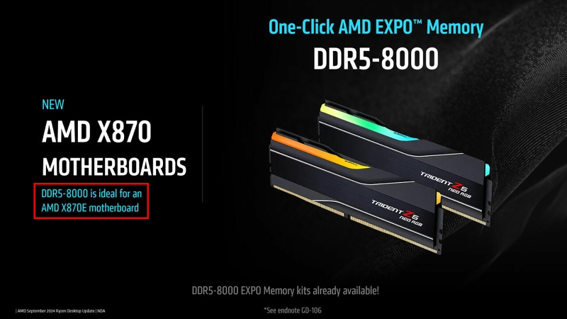 Однако продолжать рекомендовать в 2025 году для своей платформы модули DDR5-6000 компания AMD, очевидно, постеснялась. Поэтому маркетинговый отдел красных выдвинул новый тезис: «Идеальный вариант для материнских плат на чипсете AMD X870E — DDR5-8000». Таким образом, AMD стала продвигать мысль, что с переходом на новую системную логику 800-й серии ситуация с поддержкой скоростной памяти всё-таки изменилась, и теперь в флагманских платах лучше использовать не DDR5-6000, которую компания рекомендовала до этого, а более современную и скоростную DDR5-8000.