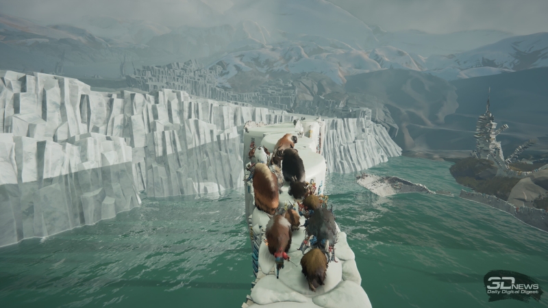 Например, мы несколько раз окажемся на территории огромной хищной птицы, что может навредить кудряшерогам или даже убить их. Чтобы избежать потерь, необходимо двигаться аккуратно и внимательно, не задевая столбики, иначе их хруст привлечёт внимание пернатой бестии. А, например, на гористых склонах могут произойти обвалы, и один из зверей внезапно окажется на грани падения. Не успеете подхватить — и вот уже в стаде на одного кудряшерога меньше… А на обледенелой горе всё ещё сложнее — лёд трескается буквально перед стадом, что потребует чуткого контроля каждого движения.