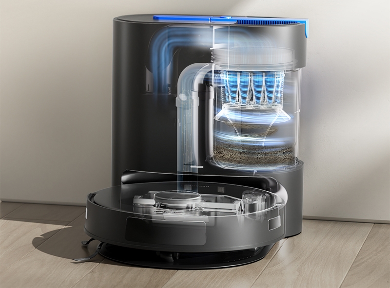 Робот-пылесос ECOVACS N20 PRO PLUS поставляется в комплекте со станцией самоочистки, которая обеспечивает опустошение контейнера пылесоса без ручного вмешательства, используя технологию PureCyclone.