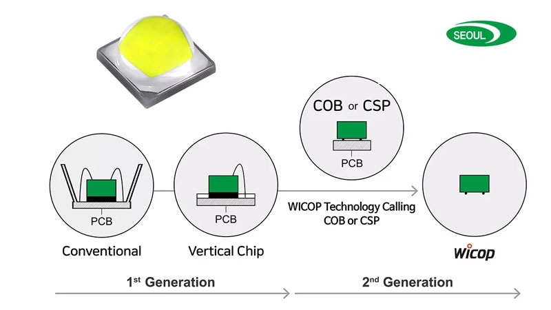 Самой передовой на сегодня разработкой Seoul Semiconductor остаётся технология производства бескорпусных светодиодов с интегрированными электродами — WICOP. Такие светодиоды можно использовать как дискретные, например, во вспышках смартфонах или в фарах автомобилей, а можно, с небольшой модификацией, использовать в дисплеях с плотностью до 2000 точек на дюйм. Компания заявляет, что технологию WICOP недобросовестные конкуренты используют для выпуска собственной продукции и называют такие типы упаковок COB, MIP, CSP.